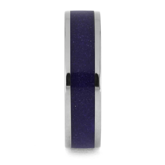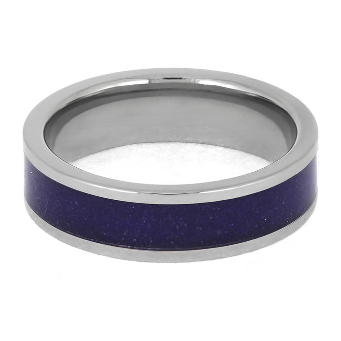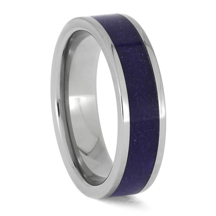 This titanium wedding band features a vibrant, colorful design inspired by the Earth. Its unique inlay of blue sand adds a touch of nature to the lightweight and hypoallergenic ring. This handmade ring is perfect for those who love the outdoors.