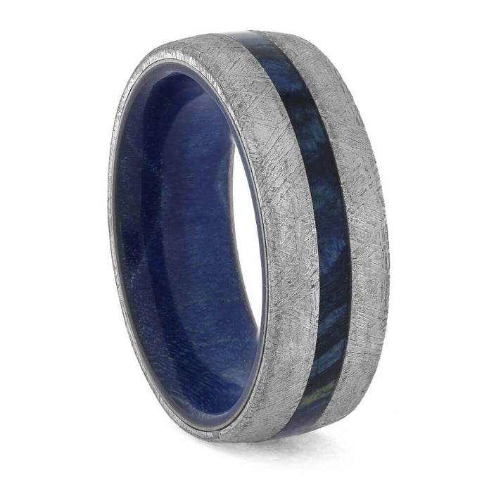 Wear a piece of outer space with this meteorite wedding band! The blue box elder burl inlay matches the comfortable wood sleeve.