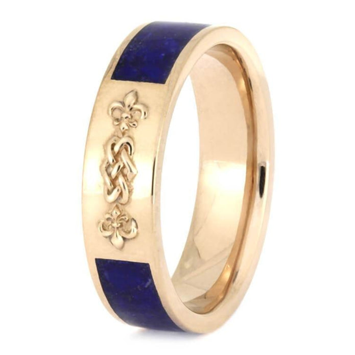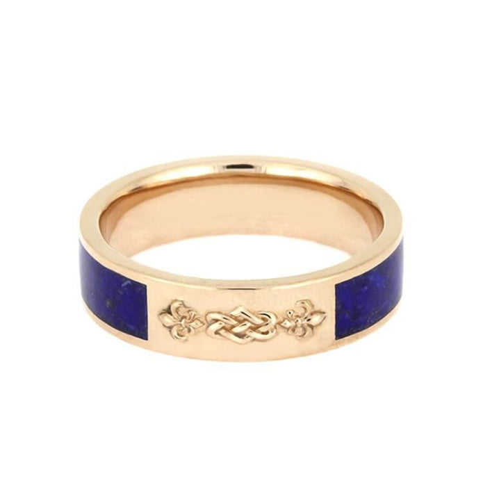 This Celtic knot wedding band pairs brilliant blue lapis lazuli with warm 14k rose gold for an elegant aesthetic. The polished rose gold sleeve and ring borders feature a detailed infinity knot design. Celebrate your Celtic heritage with this colorful and exotic lapis lazuli wedding band!