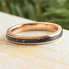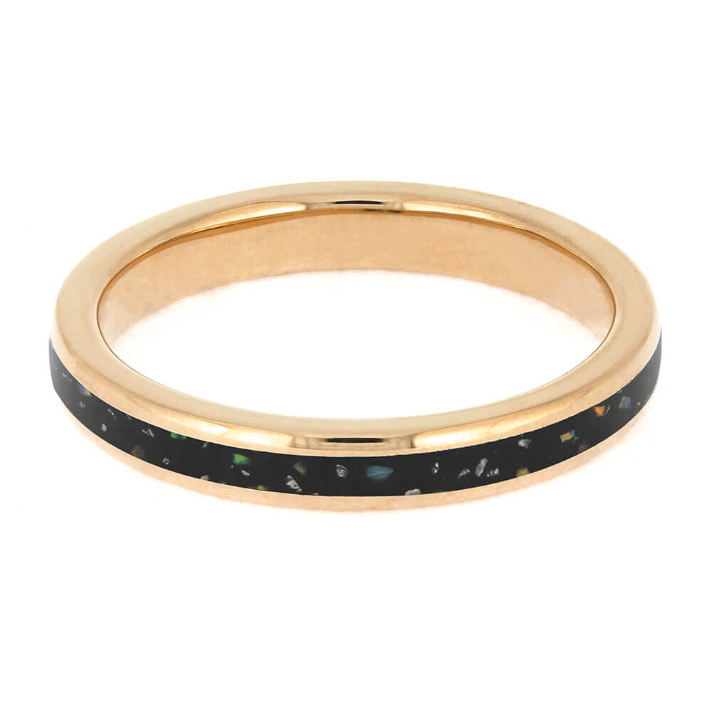 Expertly crafted with 14k rose gold and black opal Stardust, this 3mm wedding band effortlessly combines classic and modern design elements. Its polished finish reflects elegant sophistication, making it a stellar choice for your big day.