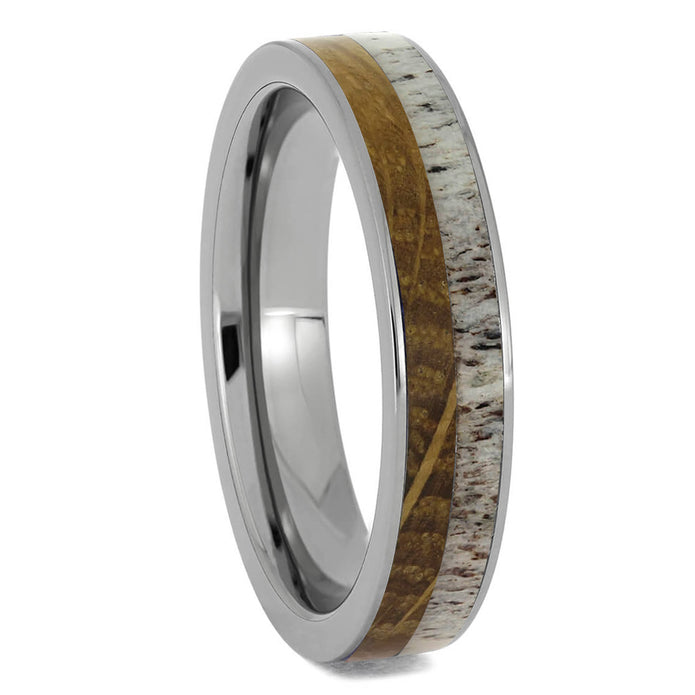 This titanium and deer antler ring features a whiskey barrel wood inlay. The iconic oak wood barrels used in the aging process of authentic Tennessee whiskey can be a part of your everyday attire. This ring is made from whiskey barrels once used by a Tennessee distillery.