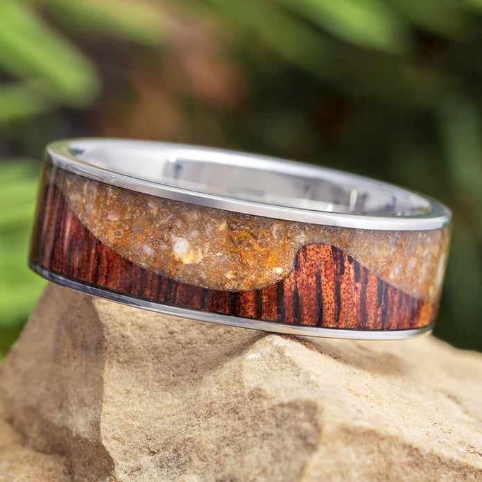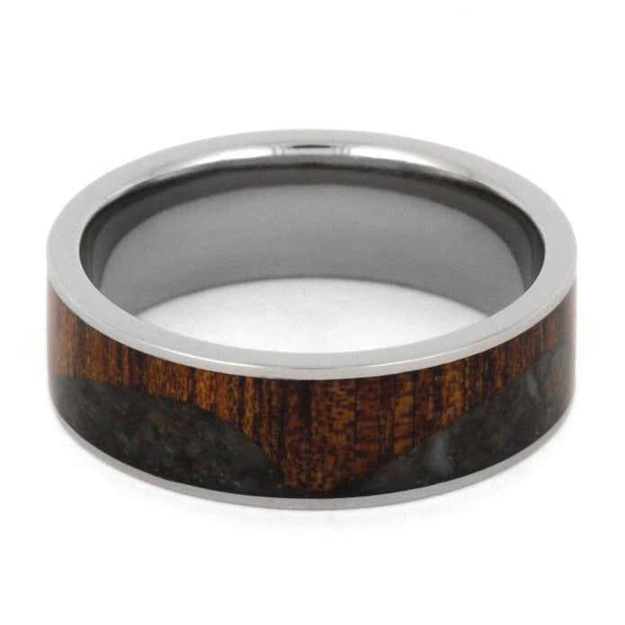 Crushed Dinosaur Bone Wedding Band With Koa Wood Wave