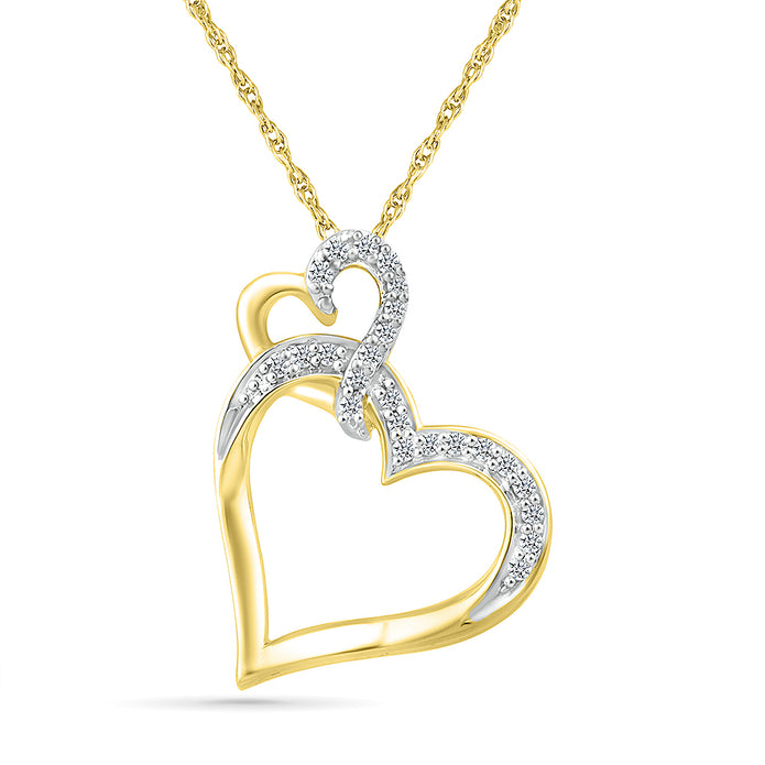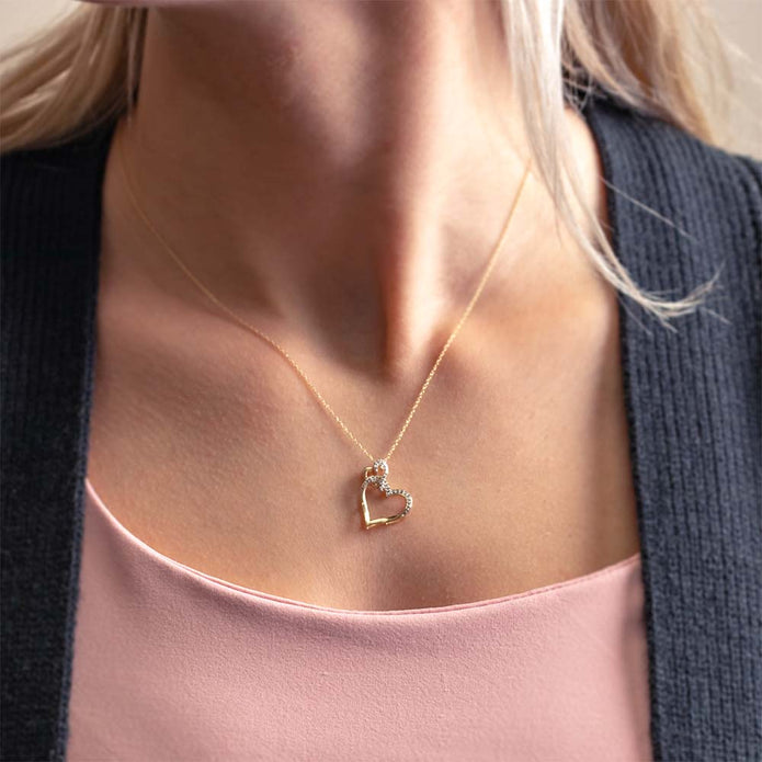 Crafted in high-quality sterling silver or gold, this diamond tilted double heart pendant necklace is sure to capture your attention. A sweet smaller open heart is interlocked with a larger open heart and both are decorated with diamonds, creating a 1/10 ct. t.w. This pendant is displayed on a high polished rope chain.