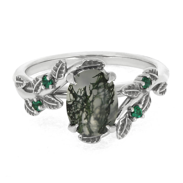 This nature inspired moss agate engagement ring features a genuine oval moss agate center stone (6 mm x 8 mm) set in a delicate, solitaire-style design. Expertly crafted in the USA, the ring showcases intricate, twisting leaf and vine elements in polished 10k white gold, bringing a unique flair to traditional engagement rings. Accented with a lab-created round emerald (1.5 mm), this floral leaf engagement ring captures the spirit of the outdoors and is perfect for those seeking a distinctive, nature-inspired piece.