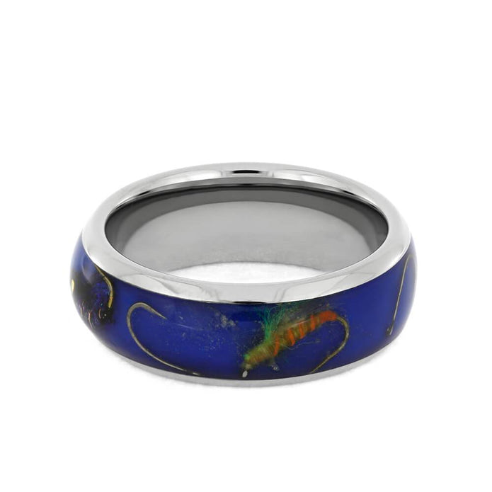 Show your true colors with this nautical blue fishing ring! Crafted with polished titanium, this ring is decorated with a blue enamel inlay and four fly fishing lures for a unique look that shows off your passion for fishing.