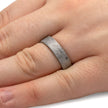 Gibeon meteorite is overlaid on this 14k white gold wedding band. This men or women’s meteorite ring is made with a comfort fit sleeve and has a flat profile. The meteorite used in each of our rings are etched with acid to reveal the Widmanstätten pattern that’s unique in every piece.