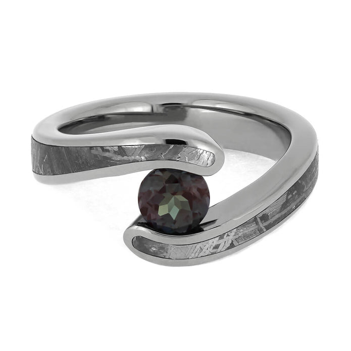 A stellar alternative hypoallergenic titanium engagement ring. Its round-cut alexandrite center stone glistens within a tension setting on this authentic Gibeon meteorite ring. Use this space ring to propose to the person who is your universe and beyond. The Widmanstatten patterns are completely one-of-a-kind to each ring, making your meteorite ring totally unique to you!
