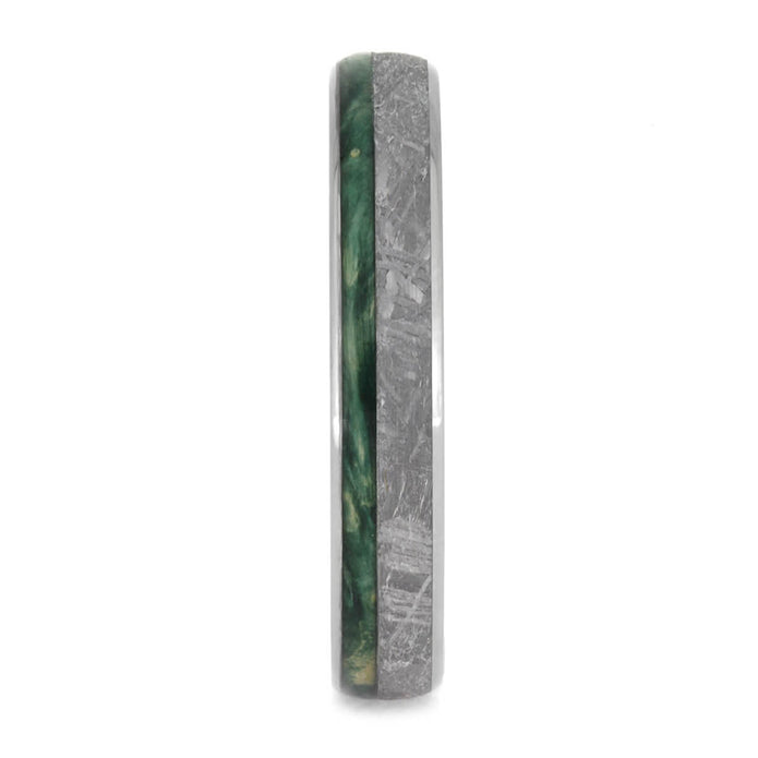 Made with beautiful materials from both Earth and space, this green wood meteorite ring is an elegant and stylish example of natural jewelry. The inlay of Gibeon meteorite contrasts subtly with the polished titanium edges, and the swirling wood grain of the box elder burl adds a vibrant accent of color to this space jewelry.