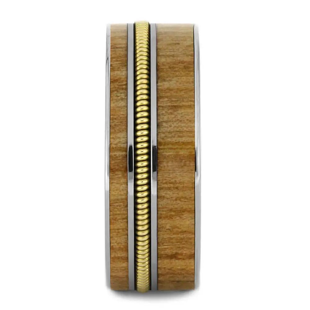This personalized titanium guitar string ring is a rocker's dream! The rowan wood in this natural jewelry is accented by a real guitar string.