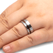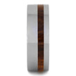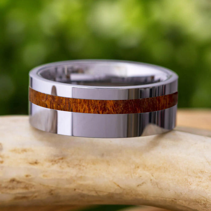 Warm, rich wood grain contrasts beautifully with this wedding band’s masculine tungsten construction. Tungsten rings are exceptionally durable and polish to a mirror-like sheen. A natural ring like this is an excellent choice for any outdoorsman or nature enthusiast.