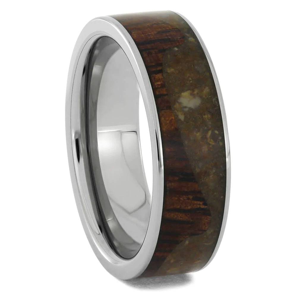 Materials in Koa Wood & Dinosaur Bone Wavy Wedding Band
