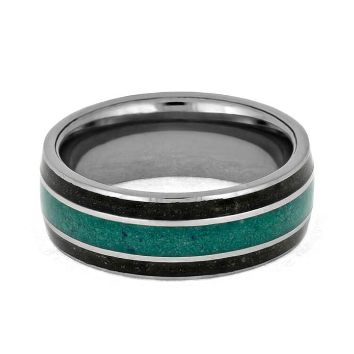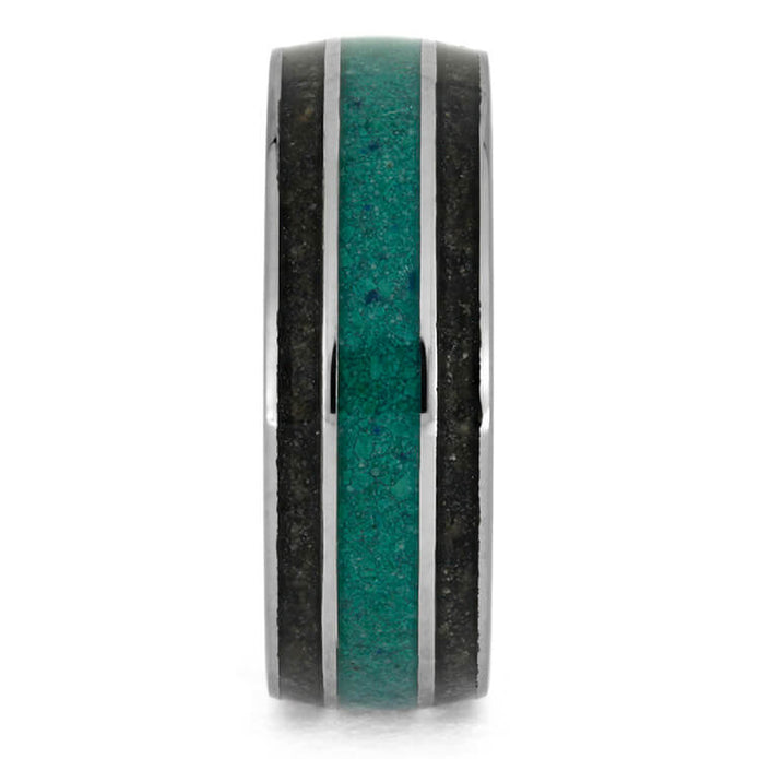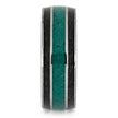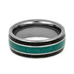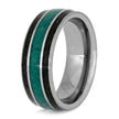 This marvelous malachite ring is an excellent conversation piece! Polished tungsten surrounds the exotic inlays of crushed dinosaur bone and vivid, green malachite. These exotic and colorful inlays are separated by shiny titanium pinstripes. Add a splash of color to your style with this vibrant fossil ring!