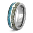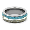 This personalized ring is the perfect memorial ring to celebrate the life of a hunting companion. The handmade titanium band is inlaid with cremains/ashes and is separated with a bright silver arrow. The vivid Kingman turquoise inlay adds a bright stripe of color for an eye-catching accent.