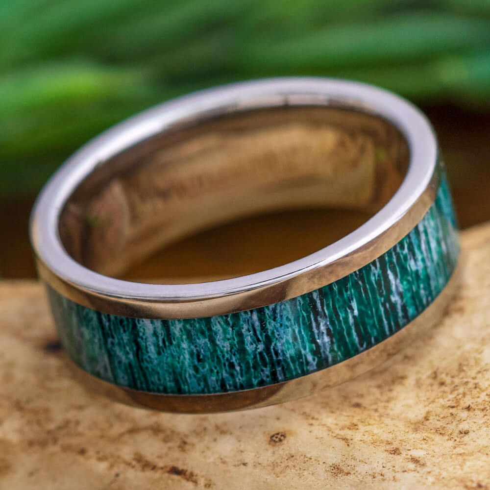 This nature inspired wedding band features a colorful green deer antler inlay set in a polished titanium band. Ring armor waterproofing is included so the antler will never be compromised.
