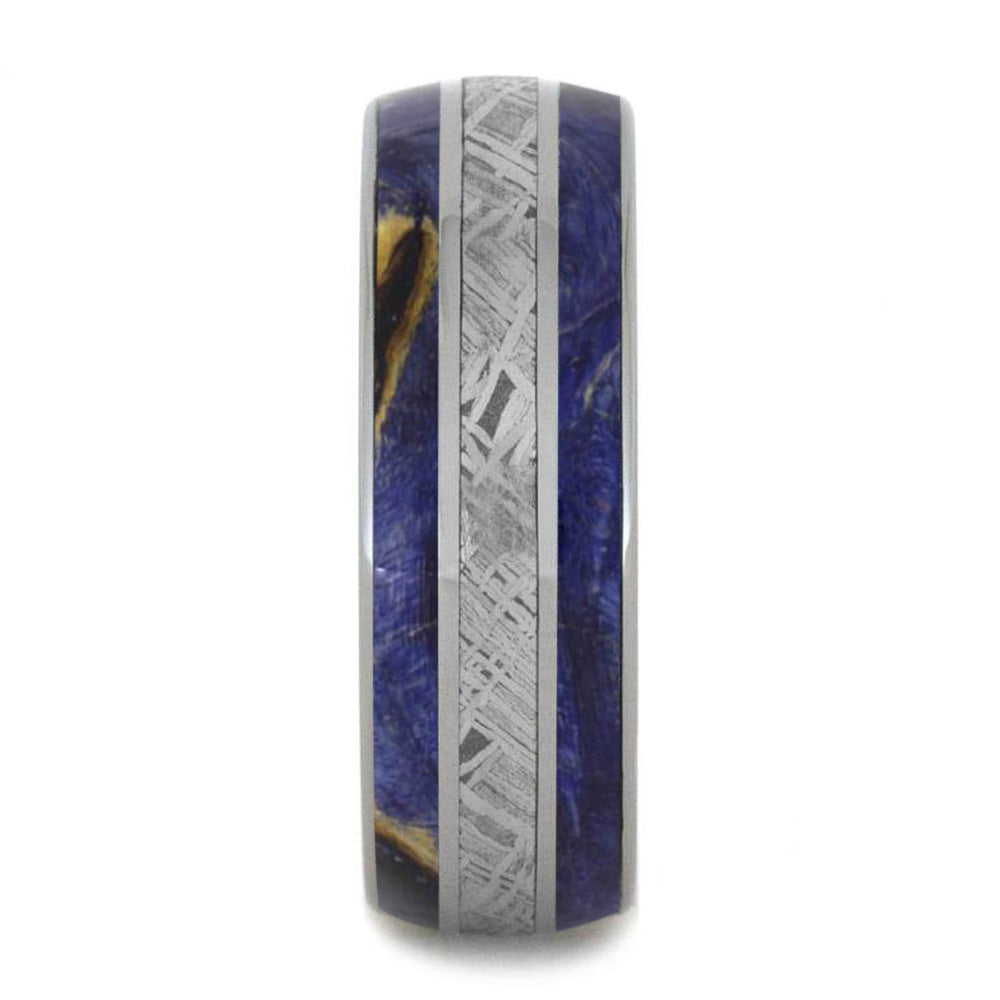 Blue box elder burl wood and real meteorite inlays adorn this handmade ring for a look that's out of this world. Distinctive titanium borders separate the unique inlays for extra durability.