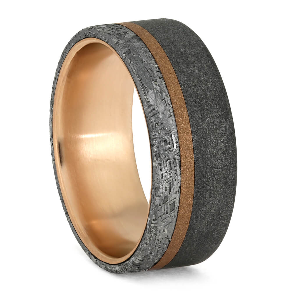 Men's Meteorite Wedding Ring With Rose Gold And Sandblasted Titanium