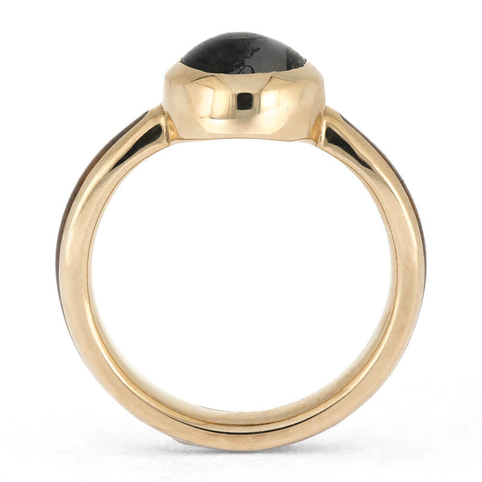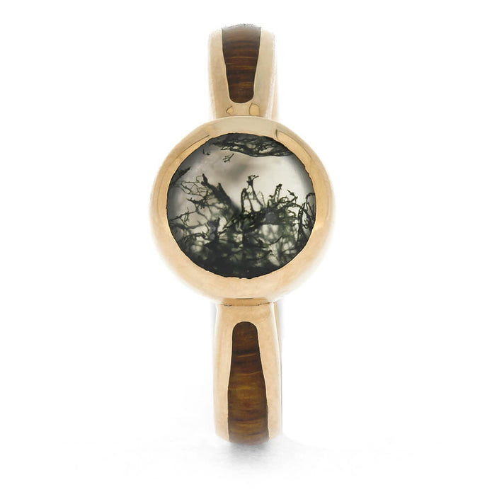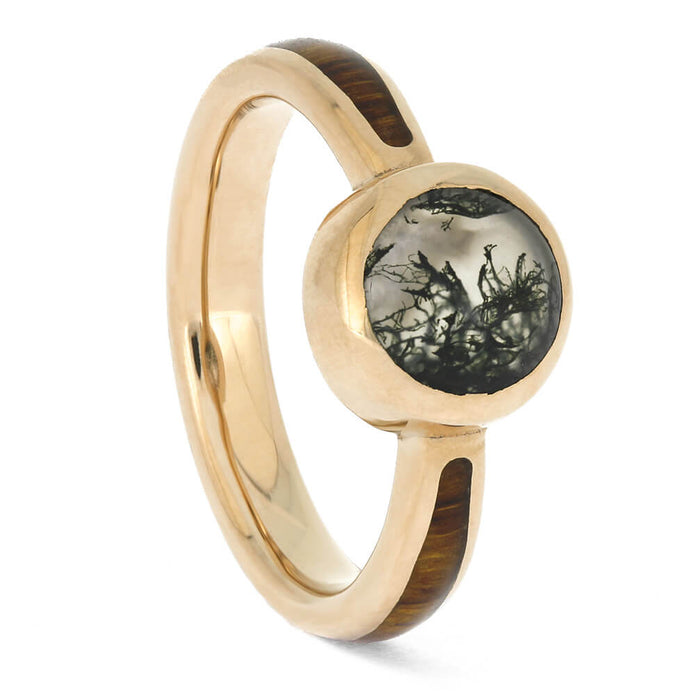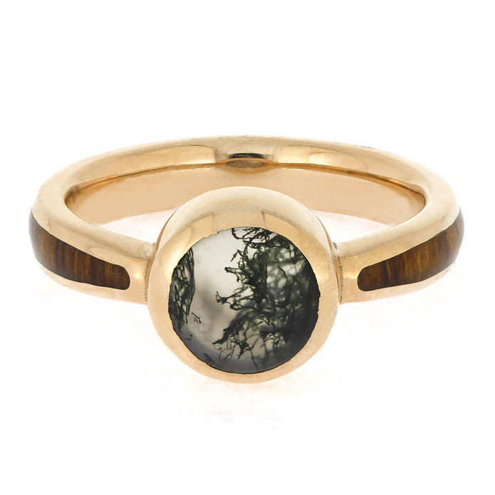 Expertly crafted with a unique moss agate cabochon, this ring showcases a distinctly natural style. The solid rose gold bezel sets off the sizable cabochon perfectly. The tapered shank is embellished with ironwood, elevating the design with a natural twist.
