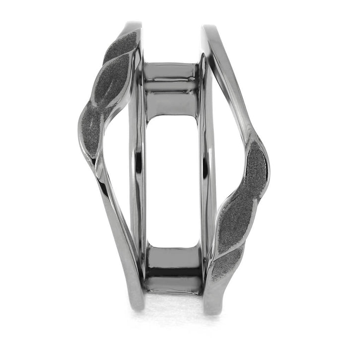 Crafted with the intention of seamlessly accompanying your engagement ring, this handcrafted titanium ring guard showcases two sets of floral-inspired embellishments in a sandblasted finish. The delicate titanium bands are slim, perfectly complementing the design of the engagement ring.