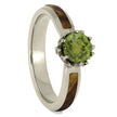 Materials in Peridot Engagement Ring with Diamond Lotus and Black Ash Burl Wood