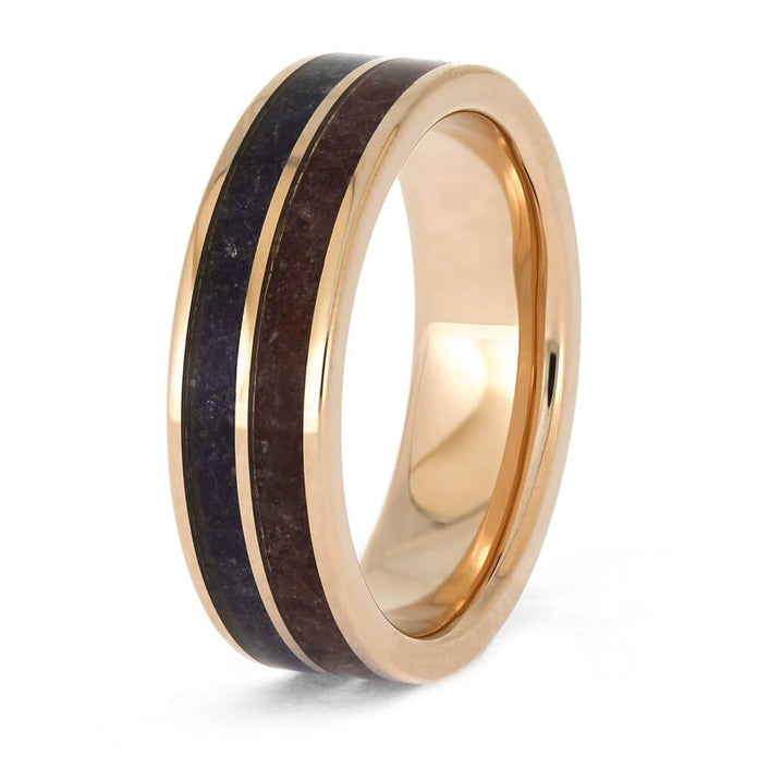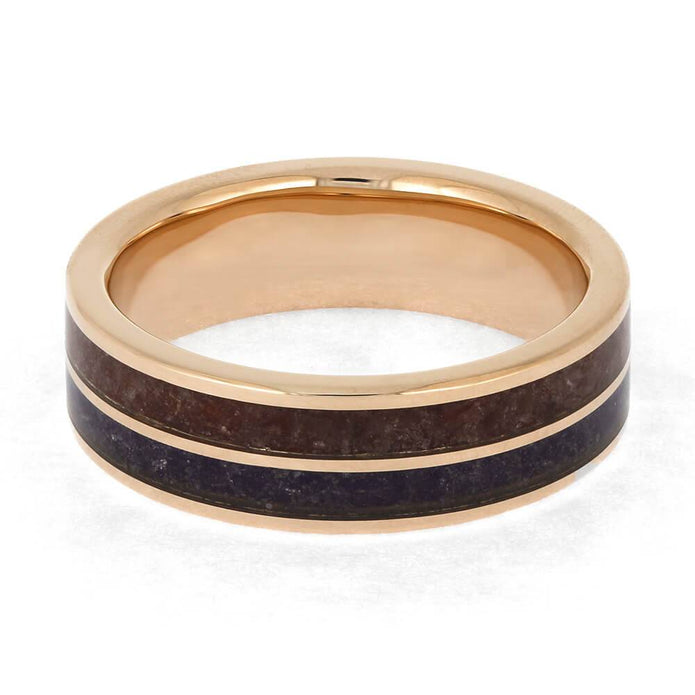 This expertly crafted 14k rose gold ring is a symbolic representation of you and your significant other. Its sleek design boasts dual birthstone inlays and a timeless polished finish, making it a perfect wedding band. This ring features crushed red ruby (July) and purple amethyst (February) stones; contact us to personalize the birthstone inlays in this design today!