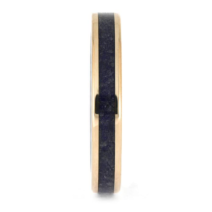 Commemorate your birth month with this expertly handcrafted birthstone wedding band. Its polished 14k rose gold surface is enhanced by radiant sapphire fragments, creating a uniquely striking piece. Celebrate nature with this distinctive ring, handmade in the USA.