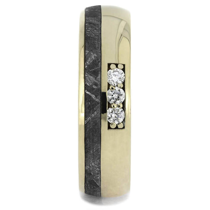 Enjoy a cosmic twist on your 14k white gold wedding band with an authentic meteorite inlay. Three round-cut diamonds, symbolizing the growth of your relationship, make an excellent addition to this ring. Customizable gemstone options are also available; just contact our design team!