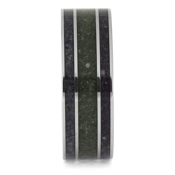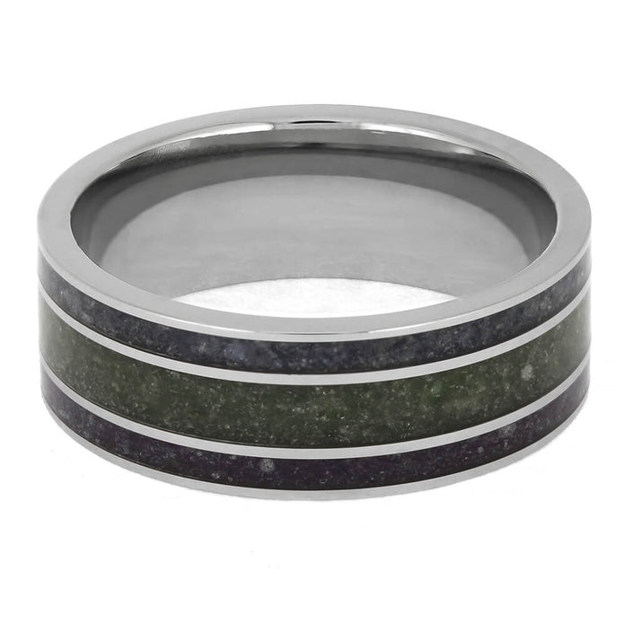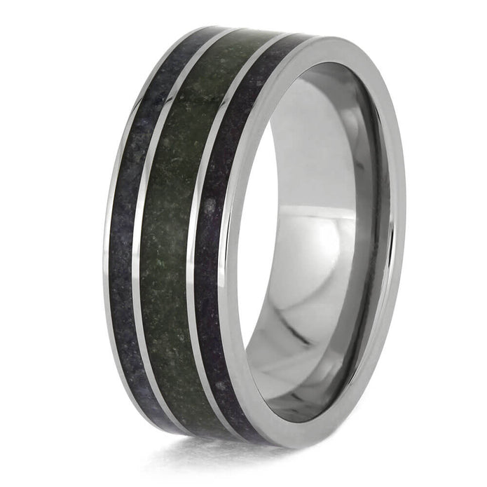 Celebrate the important birthdates of your loved ones with this triple birthstone ring. This handmade band is adorned with crushed amethyst, peridot, and sapphire birthstones, giving it a colorful and meaningful twist. This unique band features titanium edges that provide a robust, rugged look, complemented by our Ring Armor Waterproofing coating to enhance its strength and extend its lifespan.