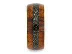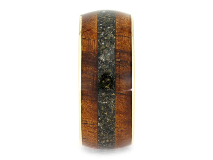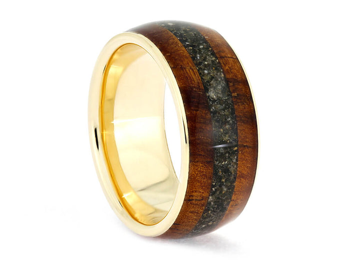 Inject a tropical twist into your style with this 14k yellow gold Koa wood ring! This wedding band has inlays of Hawaiian Koa wood and beach sand, with borders of lustrous gold. A wood ring like this one is perfect for your outdoor wedding!