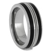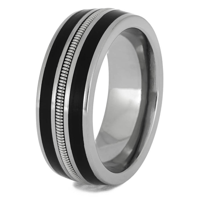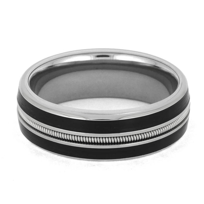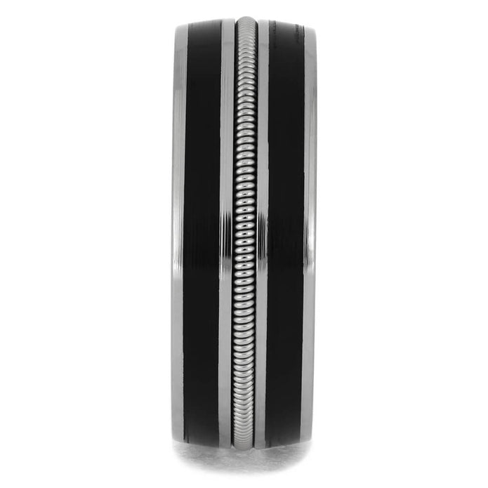 Declare your love for music with this vinyl wedding band for men. Down the middle of this titanium ring is a guitar string inlay, flanked by vinyl record inlays. Contact our custom design team and get a music-themed wedding band made for you or your audiophile husband!