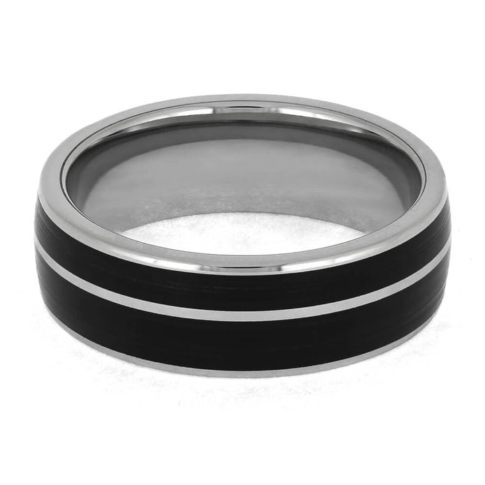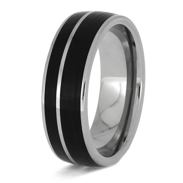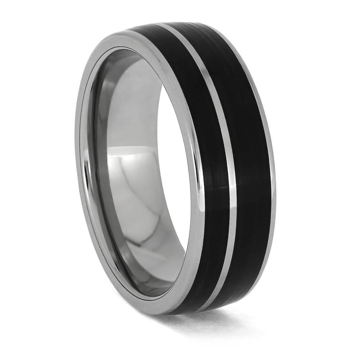 Perfect for the musician in your life, this men's wedding band with a vinyl record inlay is sleek and stylish. Polished titanium edges contrast the dark vinyl record inlay, giving this ring a modern look.