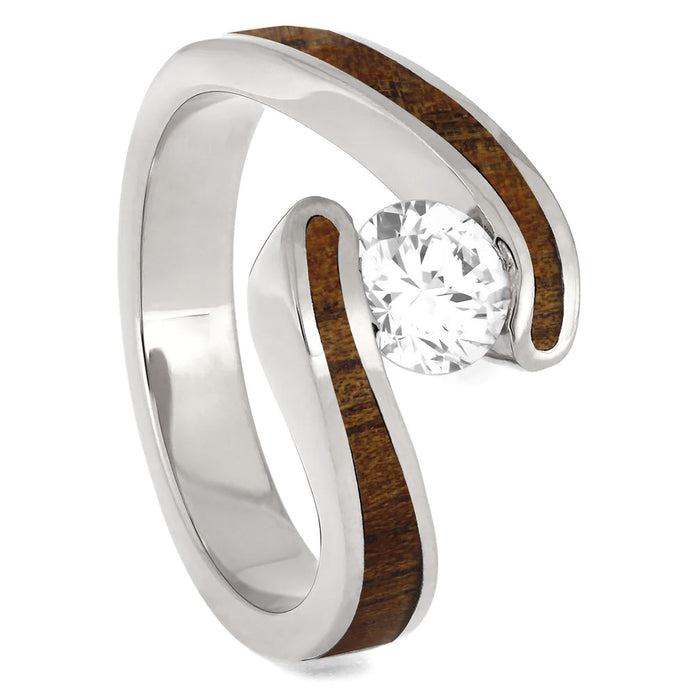 Wow your bride to be with this elegantly designed women’s wood engagement ring. Her eyes will shine with joy when she sees this stunning tension-set moissanite engagement ring. The sleek titanium band is inlaid with environmentally friendly Koa wood, a natural element adding one of a kind appeal to the design.