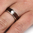 This 14k white gold wood engagement ring places a 3 mm diamond in a gold full bezel setting. The bright round diamond is complemented by the surrounding dark reddish ipe wood. Celebrate your future outdoor wedding with this diamond wood engagement ring!
