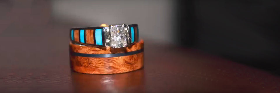 When we saw your Cathedral Ring design Erin was in love, so we decided to have it made with turquoise - Erin's birthstone, and Black Cherry - a beautiful wood that is native to the area where we met - Port Dover, ON. We used to hike and bike the Port Dover area woods on the weekend, and it was a spot we really go to know each other, talking and laughing, so it felt right to include it in the rings. To complement her engagement ring I had a Black Cherry wood overlaid over tungsten and the two rings look fantastic together.