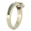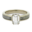 This solitaire engagement ring has an emerald-cut moissanite in antler style prongs, accented by naturally shed deer antler. If you send in your own antlers, we can use them in the design and make this nature-themed engagement ring even more personal, and symbolic for you.