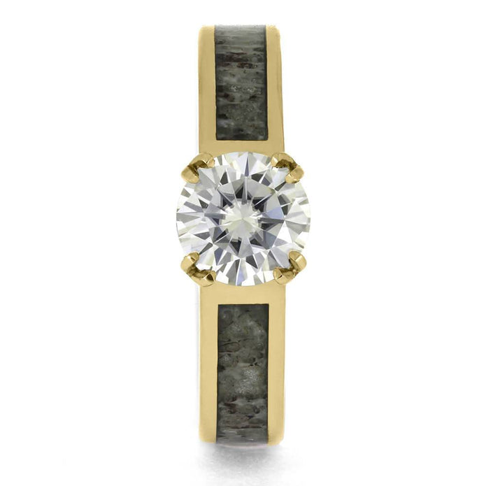 This distinctive engagement ring is ideal for any nature enthusiast who lives for the outdoors. It showcases an exclusive design, featuring a moissanite gemstone held securely by antler prongs. The 14k yellow gold band incorporates natural antler inlay, creating a truly unique appearance.
