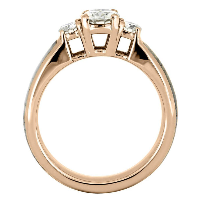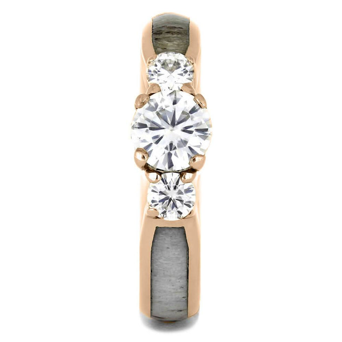 This 14k rose gold engagement ring features three stunning moissanites and a deer antler inlay. The three stone design symbolizes the past, present, and future, making it a meaningful and exquisite choice for your loved one. The inlay of antler is naturally shed, but you're welcome to send us your own antler for an extra personalized ring!