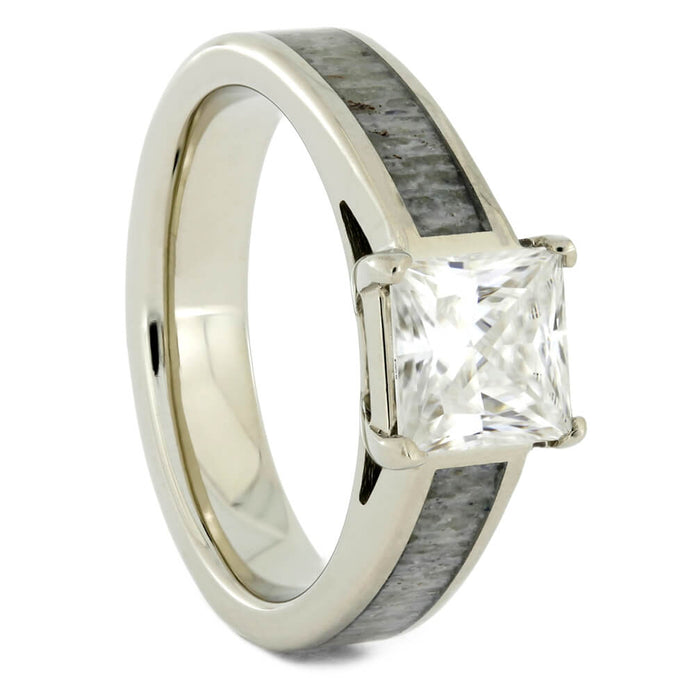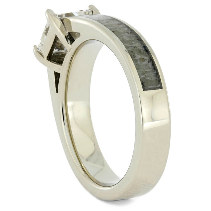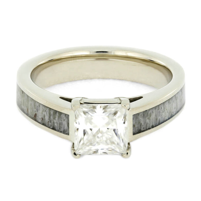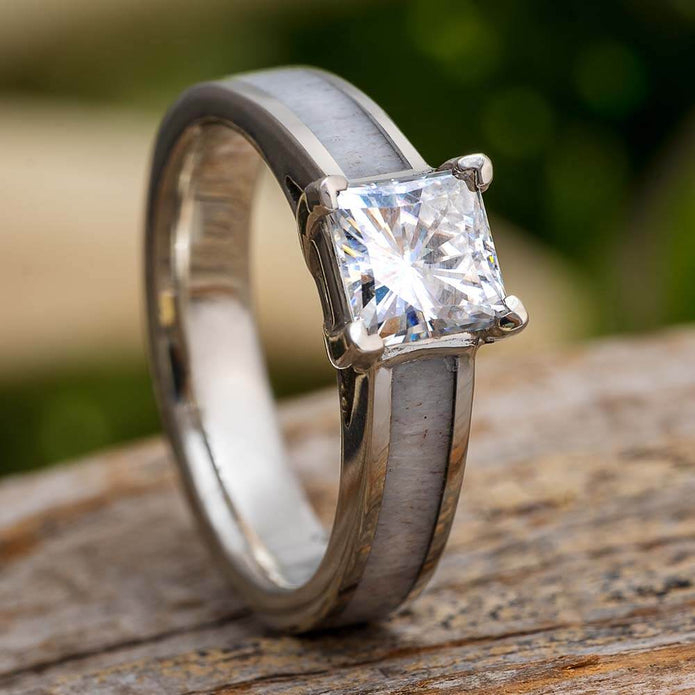 Share your mutual love for the outdoors and each other with this square moissanite engagement ring. This alternative ring features twin partial inlays of deer antler. The natural inlays are centered around an elegant channel setting that frames and upholds the center stone. The solid 14k white gold is polished to perfection.