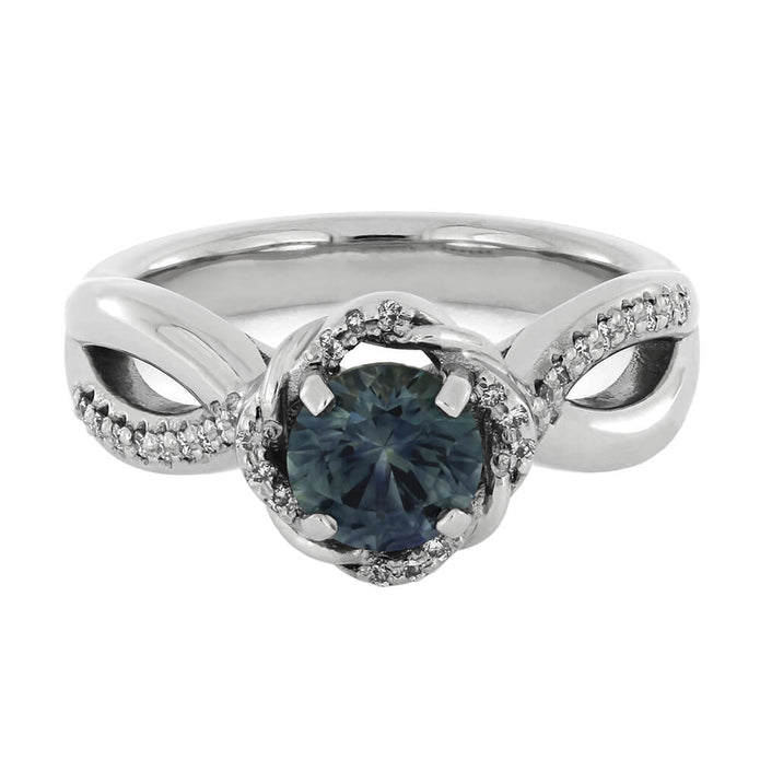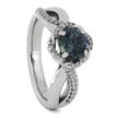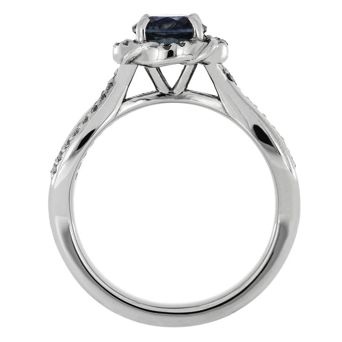 Pop the question with this stunning London Blue Topaz engagement ring featuring a unique twisting shank with diamond accents. It also features a hidden inlay of crushed antler on the underside. Customize this twist style ring to feature a different gemstone and/or inlay material, if desired.