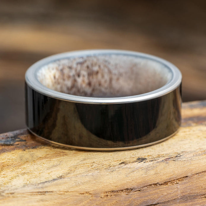 Dark and enchanting blackwood gives a calm and simple look to this all natural ring. While the deer antler shows off a unique pattern to complement it all on its own.