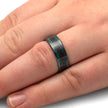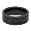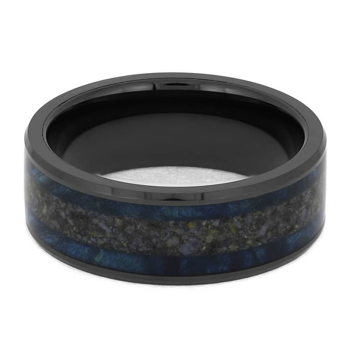 This men's wedding band has two stripes of blue box elder wood burl, bringing some vibrant color to the dark and masculine design. The center is decorated with crushed dinosaur bone, adding an exotic texture to this black ceramic ring.