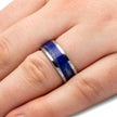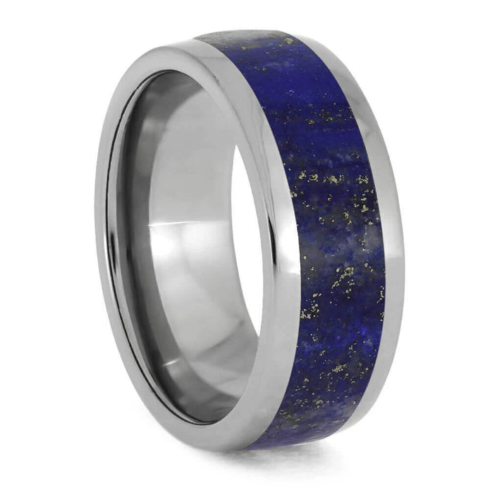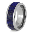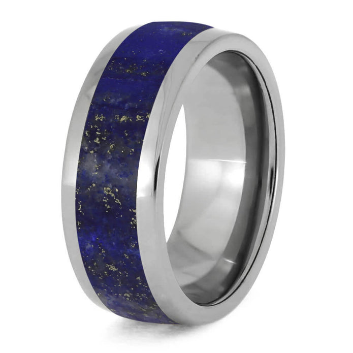 This men's lapis lazuli ring is handmade with a comfort fit titanium sleeve and has metal edges. Lapis lazuli is an intensely blue semi-precious stone with natural hints of golden yellow visible in the stone itself.