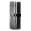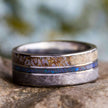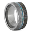 A perfect option for your "something blue" with a unique twist! This meteorite and dinosaur bone ring is handmade and is inlaid with crushed opal in the center. It has a smooth and comfortable titanium sleeve and titanium edges.