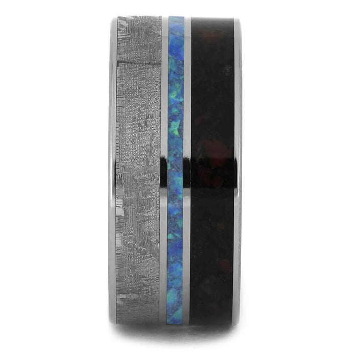 Materials in Opal Wedding Band, Meteorite and Dinosaur Bone Ring