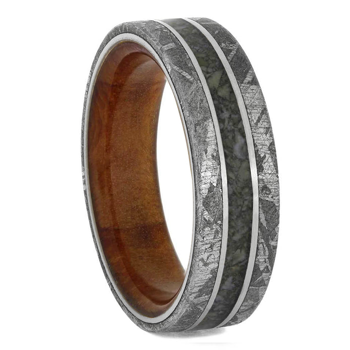 Dinosaur Bone Men's Ring With Meteorite, Wood Sleeve