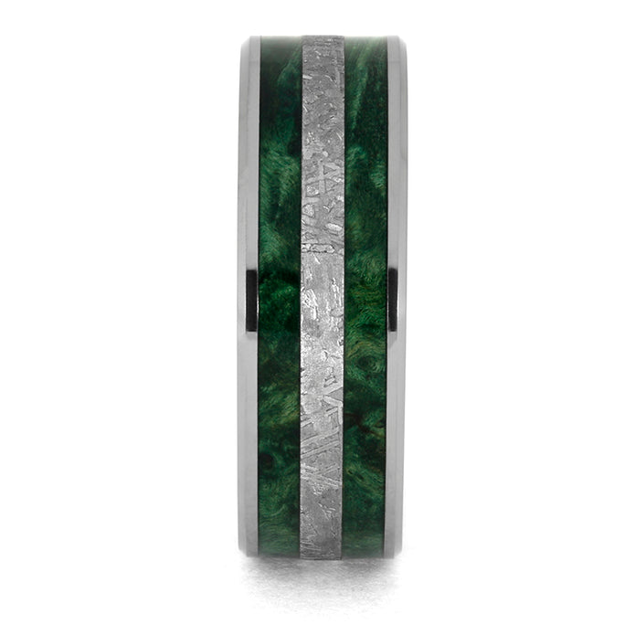 This meteorite ring has two inlays of green box elder burl and a stellar central pinstripe of authentic Gibeon meteorite. Crafted with polished and tough tungsten, this is a manly band for any man, especially your groom.