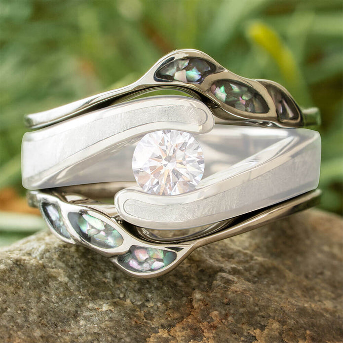 Expertly designed to accompany your engagement ring, this custom pearl ring guard features two stunning floral designs with Mother of Pearl inlays. The sleek titanium bands effortlessly complement the overall aesthetic of the engagement ring.