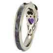 Your engagement ring can be as personal as the bond you and your other half share. This heart gemstone engagement ring is the symbol of two hearts coming together as one. The three diamonds in the center are a representation of your past, present, and future together. The heart-shaped amethyst and alexandrite both sit on a three-prong setting with a custom designed knot flowing down the band. Partial Gibeon meteorite is inlaid in the band of this 14k white gold ring for a stellar fashion.