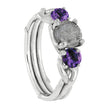 Inspired by nature, this meteorite engagement ring is truly out of this world! A pair of purple amethyst stones decorate each side of the meteorite for a unique take on the three-stone setting. The meteorite stone features an amazing Widmanstätten pattern that forms during the intense heat of entering the atmosphere.