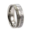 This meteorite wedding ring set includes a women’s rough diamond engagement ring paired with a deer antler wedding band for men. Both of these rings display a Gibeon meteorite inlay for a unique look. The engagement ring is 10k white gold with a wavy design, while the wedding band is made with titanium and has a smooth polished finish.