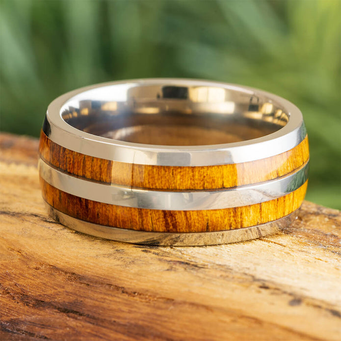 Double Inlay Titanium Koa Wood Ring, 7.5mm Round Profile, Polished Finish-SI8006
